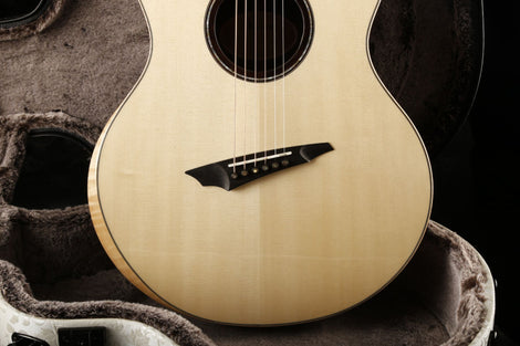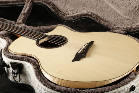 During the guitar-building process, a bevel is carefully cut from the soundboard and sides to fit an armrest that extends with the guitar's binding. The ergonomic design of beveled armrests provide comfort and support to avoid cutting off the circulation in your arm in extended periods of playing. The armrest is built to sit directly underneath your right arm in various playing positions.